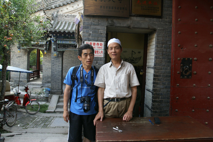2~3km 성벽을 걸어서 성문을 통해 내려와서 가게에서 아이스크림 하나씩 사먹고 청진대사를 가기위해 택시를 잡았다. 택시 안 간단다. 승차거부인가??!!  그래 시내버스도 한 번 타보는 것도 좋지….시내버스를 타고 종루에서 내려 고루를 거쳐 이슬람 거리를 지나 골목길을 이리 저리 돌아 청진사에 도착했다. 입구 문지기 한국말로 인사한다. 발음도 정확하다. 기념으로 사진 한 장 찍고…완존히 이슬람. 독특한 건물의 이슬람사원이다. 이슬람 문화가 이곳 장안에까지 왔던 것이다.  이곳의 특징은 이슬람 사원인데 중국식 건물양식으로 지어졌다는 것이고 아담하게 꾸며진 정원들로 꽉차있다. 이들 문화 특히 이슬람에 대해 아는 것이 없어서..
