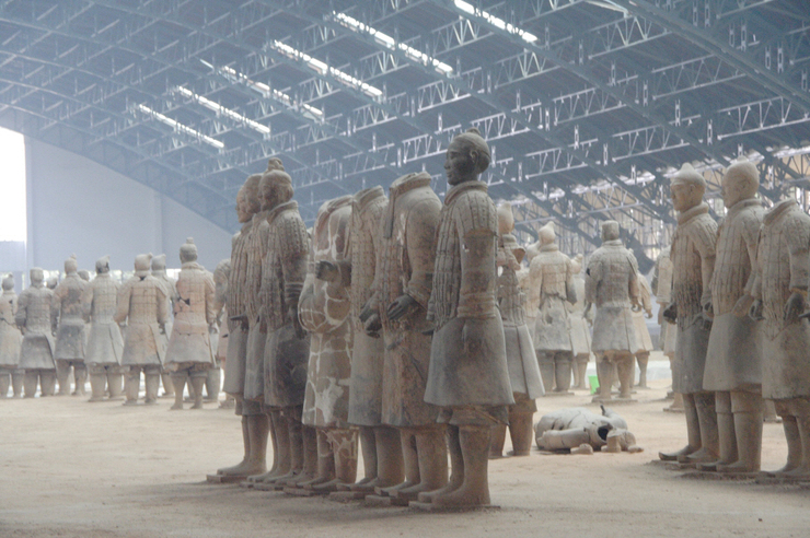 이 더위에 어디선가 음악소리와 함께 공연을 하는 모양이다 . 얼른 가자~~ 빨리 간 덕에 앞자리에서 공연모습을 카메라에 담을 수 있었다. 돈만 많이 받지 말고 이런 공연 많이 해주란 말이다.  화청지 정문 앞 차장이 말한 대로 버스를 기다리는데 날씨는 덥고 택시는 유혹하는데 15위안에 병마용 간단다. 3위안 아끼느니 시간을 아끼자고요…. 택시 승차. 그런데 택시기사 진시황릉을 지나가는데 뭐라 뭐라 한다.이유인 즉 황제에게 먼저 예를 갖추고 병사들을 보라는 것이다 . 아! 그렇구나!~ 알았어요. 참고하지…우리의 일정에 진시황릉이 없었다 . 나도 왜 그런지는 지금도 모르겠다. 일정을 내가 계획했는데도 말이다. 혹 다음에 가시는 분 있으면 그런 줄 알고 가시면 좋은 정보가 될 듯 . 그래도 우리는 우리의 계획대로 병마용을 향해 갔더니 이 기사 별로 맘에 들지 않는 모양이다. 너네 황제지 우리의 황제는 아니지….오늘 일정에서 드디어 제일 먼 그리고 서안하면 제일 보고 싶어 했던 병마용이다 . 들어서는 입구부터 진시황의 큰 동상이 압도한다. 조그맣게 좀 만들지… 넓은 주차장과 많은 차량들 사람들.. 내외국인들 …가득하다.과일 파는 아저씨 복숭아 4개 10원 샀더니 남은 6개 8원 6원 5원….자꾸 가격이 떨어진다. 가방이 무거워서 더는 못 사겠다. 거저 주지 그냥..병마용 정확한 이름은 <진용박물관>이다. 입장료 90위안/1인 표를 사서 들어갔는데 입구에 외국인을 위한 번역기가 있는데 한국어 있냐고 물어보니 없단다.  몸매 잘 빠진 아가씨 미국인과 같이 “안녕하세요?”한다. 같이 인사. 한국인인가보다. 옷을 너무 야하게 입었다. 왜 한국어는 없단 말이냐. 한국인 방문객이 많이 있을 텐데 말이다….혹시가 역시로 변하고. 이곳에서도 또 한참을 걸어야 박물관이 나온다. 그사이에 모터카를 이용 돈을…2원.. 우린 땀 삐질 삐질 흘리면서 걸어간다. 잠시 그늘에서 쉬면서 물 한 모금…제 1,2,3전시관 그리고 영화관이 있다. 두루 돌아보고 휴게실에 들러 컵라면과 커피 물을 사서 마시며 휴식..너무 크게 만들어서 구경하기 어렵게 만든 것이 중국 관광지의 특징인 것 같다.
